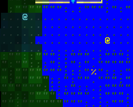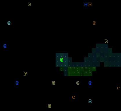I stared at a horrible-looking game for a while as I tried to figure out how to make it look nice using only ASCII. I started with a green-blue hue applied globally, and ended up with a combination of that and brogue-like colour offsets.