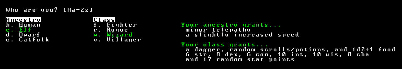 I started with character creation. Four ancestries and four classes: human, elf, dwarf, and catfolk, and fighter, rogue, wizard, and villager. Each ancestry grants some intrinsic abilities, like minor telepathy for elves or increased unarmed damage for catfolk, which can never really be lost, unless one were to change ancestry somehow. Class is more temporary: it determines starting stats and inventory, and stat total in general, but any of those things can be tweaked during gameplay. A villager can end up as strong as a fighter, they just start off weak.