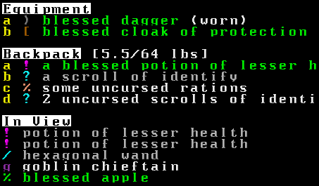 There’s a side-panel showing everything in the backpack and everything in sight, keyed by glyph, and with names coloured by identification status.