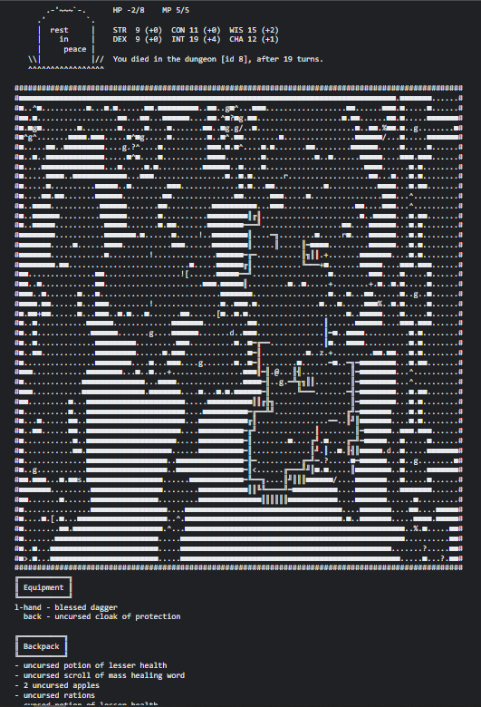 This week was for showing off. I finished off the remnants of morgue files. In the WASM build, they go to the console, otherwise they get saved to disk. Here’s one from a run where I died more or less instantly.